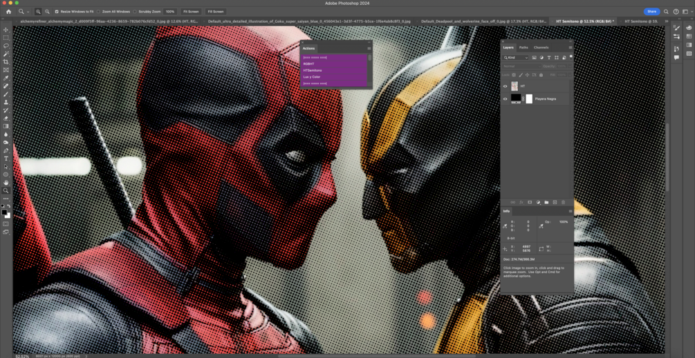 Nueva Acción RGBHT 1.0 sencilla para cuando requieres en pocos pasos realizar semitonos , como recomendación se debe de optimizar la imagen antes de correr la acción y dejar los negros puros de la imagen ya que esta acción elimina las tonalidades negras con porcentajes y trama la totalidad de la misma.
